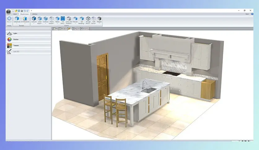Con un programa de software, puede renderizar dibujos en 3D y en ángulo, como modelar pisos y proyectar curvas con su característica fotorrealista.