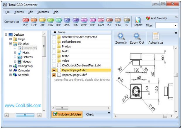 Convertidor CAD total CoolUtilsConvierte archivos CAD PPDF, TIFF, JPEG, BMP, WMF, PNG, DXF, BMP, CGM, HPGL, SVG, PS y SWF. Los formatos de origen incluyen dxf, dwg, dwf, dwfx, plt, hg, HGL HPG, PLO, hp, HPL, hpgl, hp1, hp2, HPGL2, GL2, SPL, SVG, cgm; en resumen, puede convertirlos fácilmente.