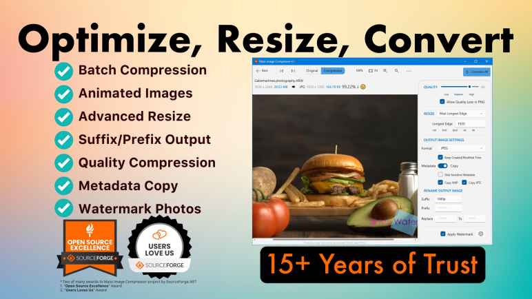 compresor de imagen masiva, Es un software que le permite comprimir y optimizar colectivamente sus imágenes. Es posible guardar sus archivos de imagen y video en varios formatos, como AVIF, HEIC, JPEG, WebP, aplicando varias funciones, como cambiar el tamaño, agregar marcas de agua y comprimir imágenes por lotes. También tiene varias características, como alojar imágenes a través de las redes sociales, compartir varias imágenes a la vez, ser un profesional en tecnología de medios, admitir varios formatos de entrada y salida para animaciones, compresión de alta calidad, conversión y optimización de imágenes.